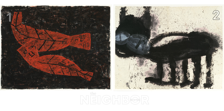 1 ³ëÀº´Ô, ‘µÎ³ª¹« ÀÙ»ç±Í »ç¶÷µé’, 1986, ÇÑÁö¿¡ È¥ÇÕ Àç·á, 215×280cm. Courtesy of the artist and Hyundai Hwarang. Çö´ëȶû Á¦°ø. 2 ³ëÀº´Ô, ‘°ËÁ¤ °í¾çÀÌ’, 1986, Á¾ÀÌ¿¡ ¾ÆÅ©¸±¸¯, 181×233cm. Courtesy of the artist and Hyundai Hwarang. Çö´ëȶû Á¦°ø.