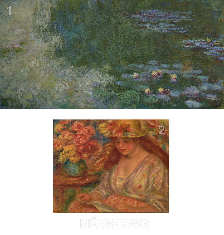 1 Ŭ·Îµå ¸ð³×, ‘¼ö·ÃÀÌ ÀÖ´Â ¿¬¸ø’, 1917~1920, ĵ¹ö½º¿¡ À¯È ¹°°¨, 100×200.5cm, ±¹¸³Çö´ë¹Ì¼ú°ü À̰ÇÈñ Ä÷º¼Ç. 2 ÇÇ¿¡¸£ ¿À±Í½ºÆ® ¸£´©¾Æ¸£, ‘³ë¶õ ¸ðÀÚ¿¡ »¡°£ Ä¡¸¶¸¦ ÀÔÀº ¾Óµå·¹(µ¶¼)’, 1917~1918, ĵ¹ö½º¿¡ À¯È ¹°°¨, 46.5×57cm, ±¹¸³Çö´ë¹Ì¼ú°ü À̰ÇÈñ Ä÷º¼Ç.