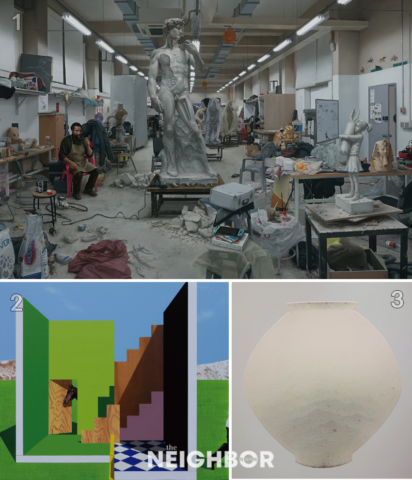 1 ±Ç´É, ‘From Studio Chaos’, 2025, Oil on canvas, 92×135cm. Courtesy of the artist. ¾Æ¶ã¸®¿¡ ¾ÆÅ° Á¦°ø. 2 äÁö¹Î, ‘»ì¦ ¾î±ß³ dz°æ’, 2025, Oil on canvas, 45.5×53cm. Courtesy of the artist. ¾Æ¶ã¸®¿¡ ¾ÆÅ° Á¦°ø. 3 ÃÖ¿µ¿í, ‘karma 202410-20’, 2024, Mixed media on canvas, 76×70cm. Courtesy of the artist. ¾Æ¶ã¸®¿¡ ¾ÆÅ° Á¦°ø.