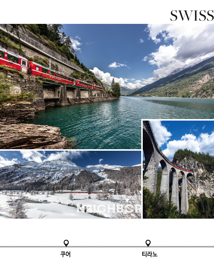 ¼³°æ°ú ¾ßÀÚ¼ö dz°æÀ» ¹Ý³ªÀý ¸¸¿¡ ¿À°¥ ¼ö ÀÖÀ»±î? À¯·´ ÁßºÎ¿Í ³²ºÎ¸¦ °¡·ÎÁö¸£´Â ÆÄ³ë¶ó¸¶ ¿Â÷ÀÎ º£¸£´Ï³ª ÀͽºÇÁ·¹½º¸¦ Ÿ¸é °¡´ÉÇÏ´Ù. ½ºÀ§½º ºÏºÎ ¿¨°¡µò ¾ËÇÁ½º°¡ ÀÖ´Â Äí¾î¿¡¼ Ãâ¹ßÇØ ½ºÀ§½º Æ÷½ºÅ°¾Æº¸, ÀÌÅ»¸®¾Æ Ƽ¶ó³ë¸¦ Á¾ÂøÁö·Î »ï´Â ½ºÀ§½º ´ëÇ¥ ÆÄ³ë¶ó¸¶ ¿Â÷´Ù. ÀÌ ¿Â÷´Â ´ëºÎºÐ ¼¼°è¹®ÈÀ¯»êÀ¸·Î ÁöÁ¤µÈ ·¡Æ¼¼Î ö·Î¸¦ µû¶ó ´Þ¸°´Ù. ¾ËºÒ¶ó·º£¸£´Ï³ª Áö¿ªÀ» °ÅÃÄ ½ºÀ§½º ¾ËÇÁ½º¸¦ Ⱦ´ÜÇÏ´Â ·¡Æ¼¼Î ö·Î´Â 13°³ÀÇ ÅͳÎ, 52°³ÀÇ °í°¡±³¿Í ±³·® µî 20¼¼±â ÃÊ Åä¸ñ °ÇÃàÀÇ ¹ßÀü°ú ÀÚ¿¬ÀÇ Á¶È¸¦ ÇÑ´«¿¡ °¨»óÇÒ ¼ö ÀÖ´Â ±æÀÌ´Ù. Äí¾î¿¡¼ Ãâ¹ßÇÑ ¿Â÷´Â ¶óÀΰÀ» µû¶ó°¡´Ù Á¡Á¡ ³ôÀº °íµµ·Î ÁøÀÔÇÑ´Ù. Áö¸®Àû À§Ä¡¿¡ µû¶ó °æ°üÀÌ Áö·çÇÒ Æ´ ¾øÀÌ ¹Ù²î´Âµ¥, ÇÏÀ̶óÀÌÆ®´Â ÇØ¹ß 1,048m¿¡ ¼¼¿öÁø ³ôÀÌ 65m, ±æÀÌ 1,063mÀÇ ¶õÆ®¹Ù¼ °í°¡±³(Landwasser Viaduct)´Ù. ¸¶Ä¡ °øÁß¿¡ ¶° ÀÖ´Â µí ¾ÆÂñÇÑ Çù°îÀÇ ¹Ù´Ú¿¡¼ºÎÅÍ º®µ¹À» Çϳª¾¿ ½×¾Æ ¿Ã·Á ¾ÆÄ¡ ±âµÕÀ» ¼¼¿ì°í ±× À§·Î ö·Î¸¦ ³õÀº °æÀÌ·Î¿î ±æ. ³ª¼±Çü Åͳΰú °è°îÀ» Áö³ª º£¸£´Ï³ª °í°³±îÁö ´õ ¿Ã¶ó°¡´Ù º¸¸é ¸ð¸£Å×¶óÄ¡ ºùÇÏ(Morteratsch Glacier)¿Í µ¿ºÎ ¾ËÇÁ½ºÀÇ °¡Àå ³ôÀº º£¸£´Ï³ªºÀµµ º¼ ¼ö ÀÖ´Ù. ´Ù½Ã ±¸ºÒ±¸ºÒÇÑ ±æÀ» µû¶ó ³·Àº °íµµ·Î ³»·Á¿À´Ù º¸¸é ±Ý¼¼ µû¶æÇÑ ³²±¹, Ƽ¶ó³ë¿ª¿¡ µµÂøÇÑ´Ù. ¿©¸§¿¡´Â ÄÚ¸ð È£¼ö¸¦ °ÅÃÄ ´Ù½Ã ½ºÀ§½º ·ç°¡³ë·Î °¡´Â Ư±Þ ¹ö½º ³ë¼± µîÀÌ Æí¼ºµÇ¾î ´õ¿í ¾ËÂù ¿©ÇàÀ» ÇÒ ¼ö ÀÖ´Ù.